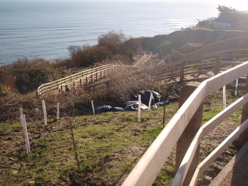 The work became essential when it was realised that the survival of the town was at stake given the extent that the East Beach and beyond was being eroded. At one time there was a farm and a road running directly from Lyme to Charmouth. Potentially the lower part of the Charmouth Rd was under threat together with the properties seaward of it. Into the cliff have been driven hundreds of concrete and steel piles which are wired together in order to stabilise the land, whilst extensive drainage work has been undertaken. It has been a huge undertaking which has taken almost two years in its construction and which the townspeople are immensely proud and thankful for.